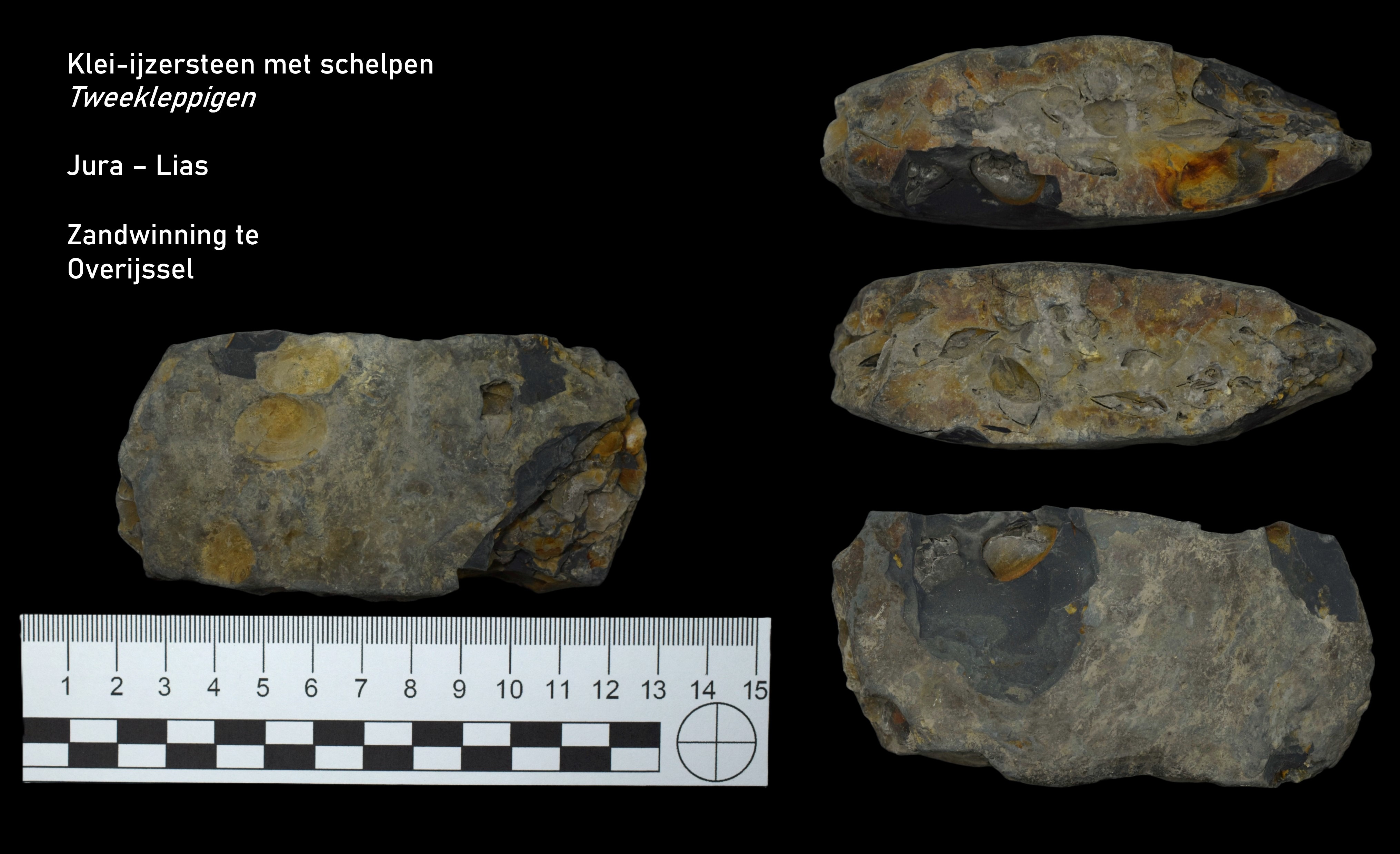 Een klei-ijzersteen met daarin verschillende fragmenten en afdrukken van tweekleppigen.