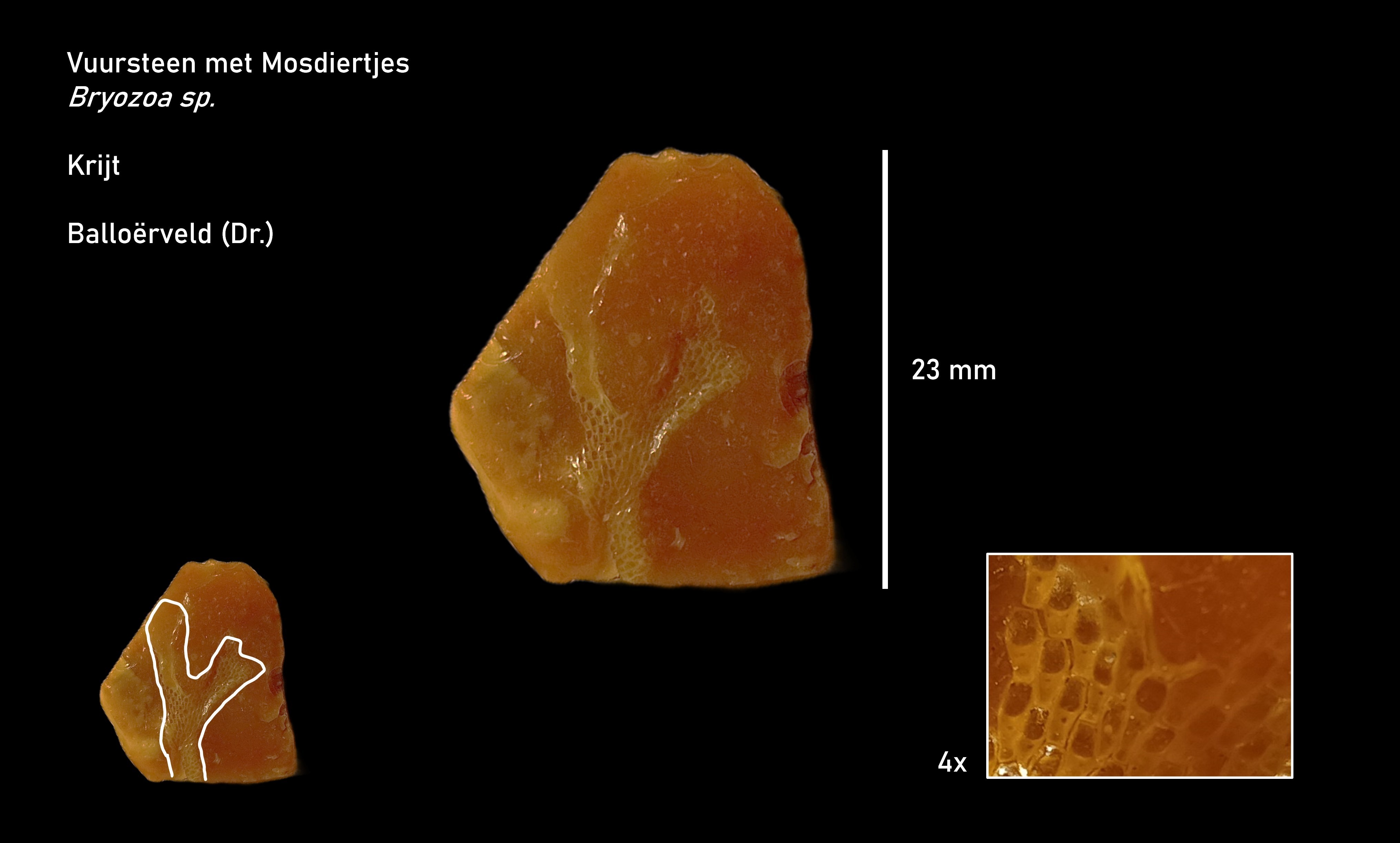 Vertakt mosdiertje in vuursteen met zichtbare kamers. Gevonden op een wandelpad aan de noordkant van het Balloƫrveld, Drenthe.