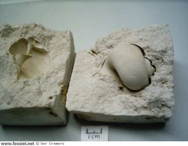 Positief en negatief van deze grote gastropode. Gevonden in de Formatie van Maastricht, groeve Curfs (niet meer toegankelijk!).