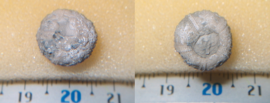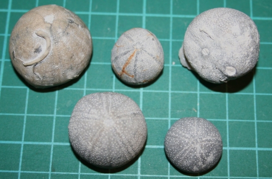 Gevonden zee-egels (galerites) van Tom. Er zitten nog meer in de tas! Foto: Tom Koops