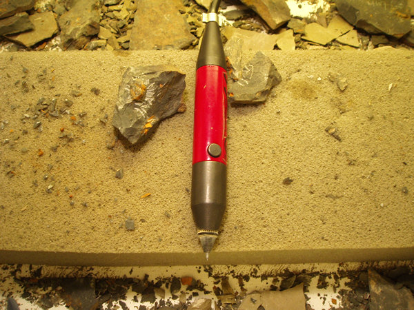 Een laatste handige toepassing van de luchtbeitel is dat je in de steen ook kunt schrijven (puntnaald). Hierdoor kun je voor altijd vindplaats, naam of formatie onder op het stuk graveren.