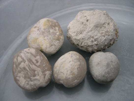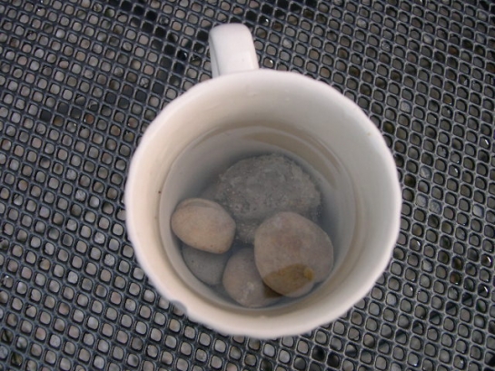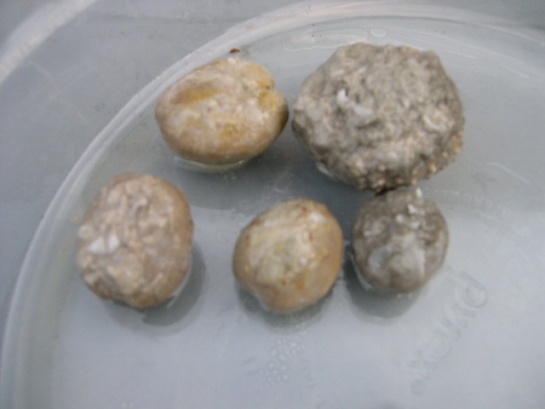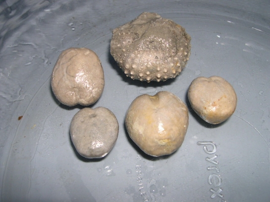 Borstel het fossiel weer goed af en leg het in proper water. Ververs het water een keer of 5 waarna het fossiel best een hele dag in het water blijft.