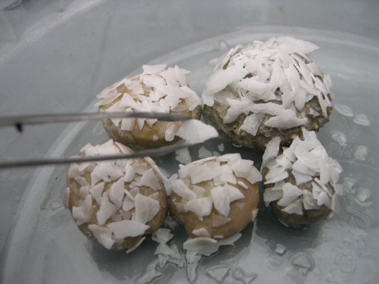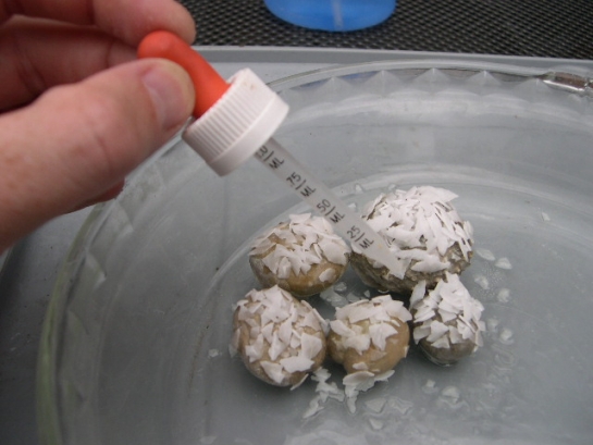 Maak de egel nat met een plantenspuit, dit vergemakkelijkt het aanbrengen van de KOH plaatjes. Breng de plaatjes aan op de plaatsen waar ze moeten inwerken, bedek hierbij de gehele schoon te maken oppervlakte van de egel.