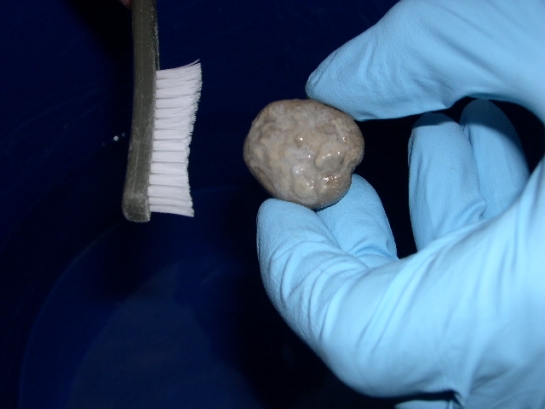 Borstel het fossiel af met een harde borstel (geen koper, messing of -ijzerborstel) in schoon water.