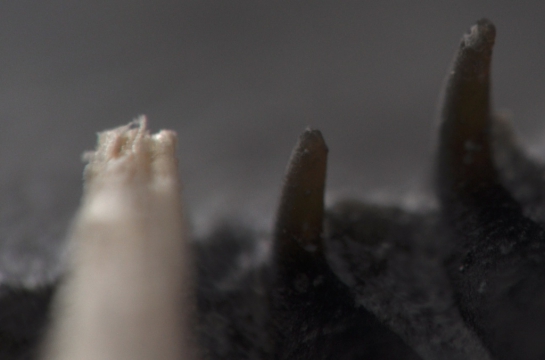 De dorsale stekels, sterk uitvergroot (tip van een tandenstoker als referentie)