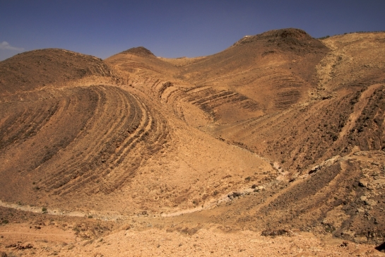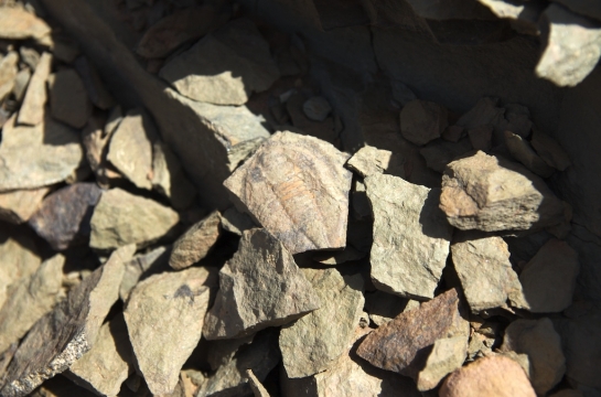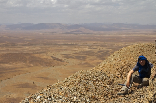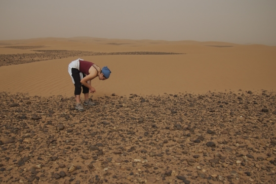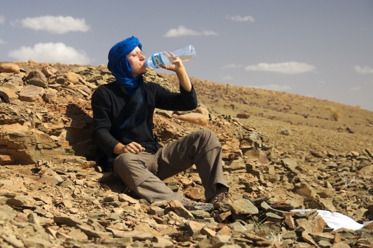 We bezoeken een Ordovicium-site in de Draa vallei. Hier dagzoomt de Fezouata-formatie, met een rijke fauna. Onder meer trilobieten, graptolieten, eocrinoïden en gastropoden worden gevonden. Het is wel hard werken. De zon is moordend, en het stof kruipt overal. Dan is zo'n sjaal opeens wel handig. In de buurt vinden we sterk verweerde restanten van een trilo die vlot over de 20 cm ging.