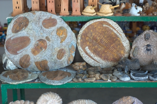 Fossielen zoeken in Marokko doe je best niet op de markt. Het aanbod mag dan wel overweldigend zijn, de prijzen zijn al relatief hoog en het aantal vervalsingen of bijgewerkte fossielen is enorm. Binnen zijn de platte ronde stenen als pizza's rijkelijk belegd met valse trilobieten, en ze worden duur verkocht. Ik ben hoe dan ook geen liefhebber van plastic, en hoewel dit soort winkeltjes een hoog entertainment-gehalte heeft, raken we er snel op uitgekeken.