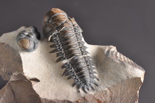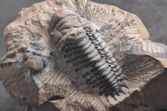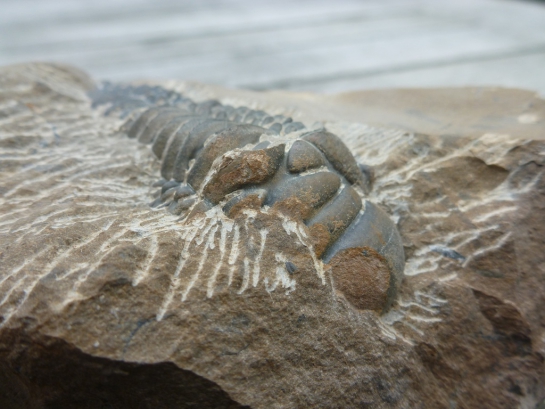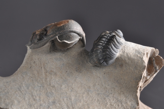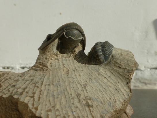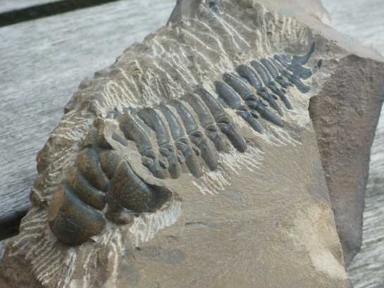 Een veelbelovend stuk, want de bewaartoestand lijkt erg goed, over de ganse lengte. Het is een flinke knaap ook, met een geschatte lengte van zo'n 7,5 cm. In dezelfde steen zit ook een sterk beschadigd pygidium van Odontochile, en een Reedops waarvan een deel van de schaal van de glabella ontbreekt, maar die wel lijkt door te lopen in de steen. Samen vormt dit toch wel een mooie associatie van 3 soorten.