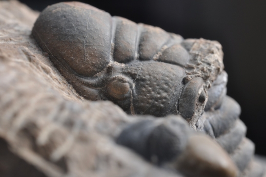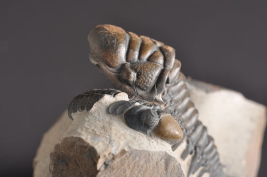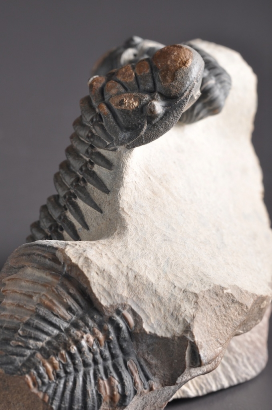 De kop van de Crotalocephalina ligt horizontaal op de bedding. Dit weten we door de luchtbellen die achterbleven onder de glabella, waarin limoniet is ontstaan dat ervoor zorgde dat het beest op die plekken slecht bewaard is gebleven. Elders is de bewaringstoestand echter ronduit schitterend. Opvallend is dat er ook heel wat steentjes in de matrix zitten waar de trilobieten op rusten, het lijkt wel een soort van grindlaag. In het vlak onder de Crotalocephalina zie je overal grijze vlekjes, dit zijn voormalige steentjes. Bij het preppen merk je naast het kleurverschil duidelijk dat deze een stuk harder zijn, en dat ze geen fossiele resten bevatten.