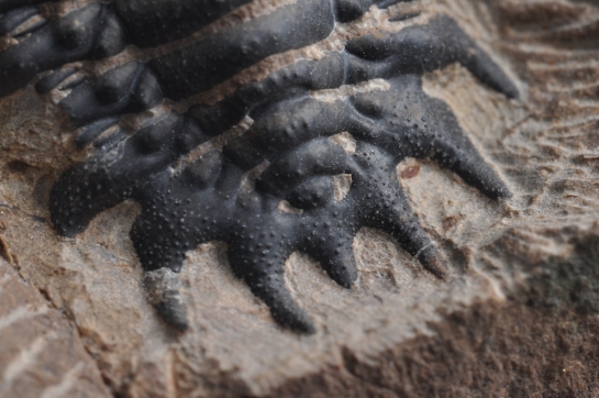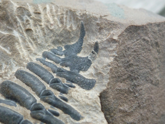 Het pygidium van de Odontochile is bewust niet geheel vrijgelegd. In het stuk matrix dat nog staat heb ik twee fragiele stekels éénzijdig uitgeprepareerd. Deze stekels lijken hol vanbinnen en gaan snel verloren bij het uitpreppen van dit soort trilobieten. Dit is een manier om voorlopig de overgebleven stekels te behouden, zonder veel tijd te moeten investeren in de preparatie van een voorts beschadigd pygidium.