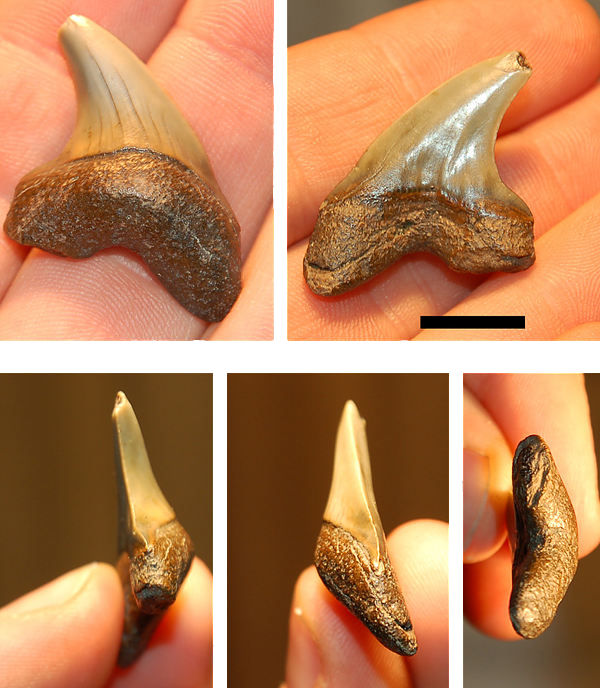 In het onderstaande voorbeeld zie je een ruwe collage van verschillende aanzichten van hetzelfde fossiel. Een maatbalkje dat 1cm voorstelt laat toe de grootte van het fossiel te evalueren. De kleurbalans is niet 100% in orde, maar dit is in de meeste gevallen voor een determinatie maar van secundair belang.