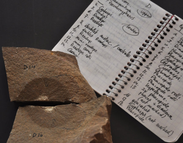 In het voorbeeld hieronder is gewerkt met een eenvoudige lettercode per site. Elke site is met behulp van een GPS ingemeten, en uitgebreid beschreven en gefotografeerd (niet afgebeeld). Op site D is in 2 lagen gezocht ('hier 'upper' en 'lower' genoemd). Fossiel D14 komt uit de 'lower' laag, in de veldnotities staat met voorbehoud aangegeven dat het wellicht om een Cornuproetide gaat. Het fossiel bestaat uit twee delen die elk met een permanent marker op het terrein zijn gemarkeerd. Deze markering is aangebracht op het breukvlak, en zal dus bij de preparatie verdwijnen en plaats maken voor het definitieve registratienummer, waarbij de bijhorende informatie direct in de database wordt opgenomen. Op die manier blijft in elke fase een koppeling bestaan tussen het fossiel en de info. Natuurlijk kan je het ook anders aanpakken. Elk systeem is goed, zolang je maar de koppeling kan garanderen in elke fase, van op het veld, over de preparatietafel, conservering, naar de collectie.