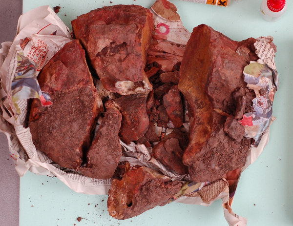 Het transport van deze ammoniet is grondig fout gelopen. Deze onregelmatige breuken vormen geen probleem, maar er moet wel een sterk hechtende en vullende lijm gebruikt worden. Om dit stuk te herstellen is een epoxylijm geschikt.