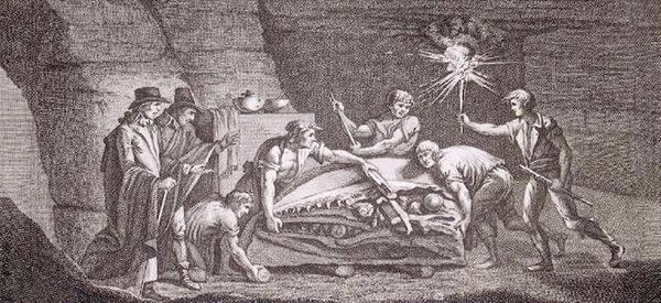 Impressie van de ontdekking van het holotype van Mosasaurus hoffmannii (Levillaire, 1799)