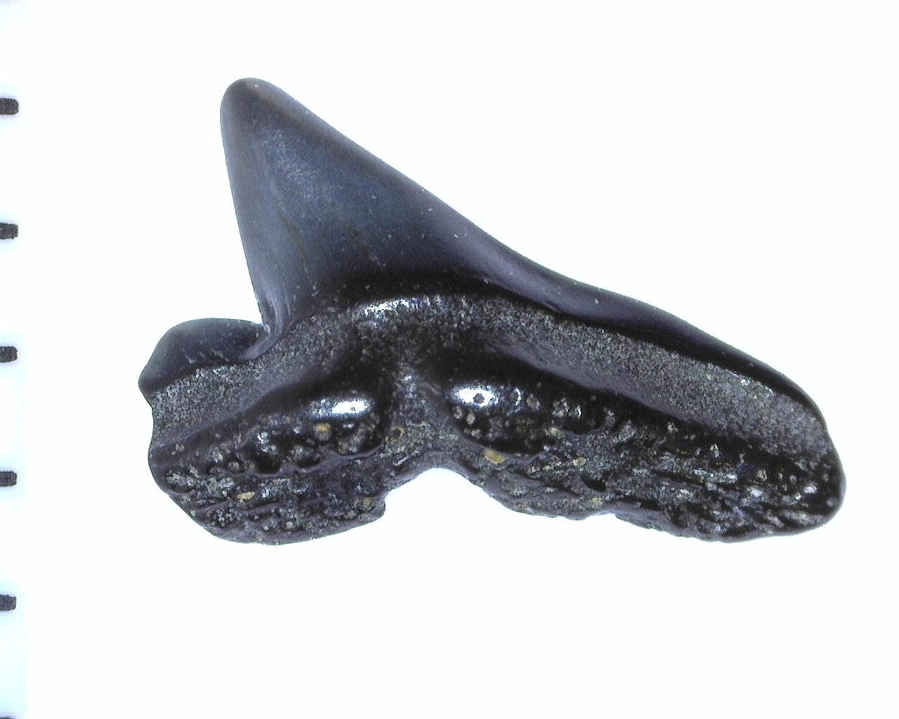 De maatlijn links is in mm. Beschrijving: De kroon ter hoogte van de kroonbasis is relatief breed. De ene snijrand van de kroon loopt door tot op de wortellob. De andere snijrand is zeer kort en recht en vormt een scherpe hoek met de zijspits. Deze zijspits is driehoekig en knobbelvormig. Het kroonvlak langs de zijde van de voedingsgroef is bolvormig. De andere zijde is vlak. Beide kroonzijden zijn glad. De voedingsgroef is diep uitgesneden. De wortel is ondiep met afgeronde wortellobben. (Bron: Taxonomy and biostratigraphy of the elasmobranchs and bony fishes (Chondrichthyes and Osteichthyes) of the lower-to-middle Eocene (Ypresian to Bartonian) Claiborne Group in Alabama, USA, including an analysis of otoliths)