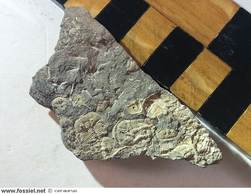 Mooie verspoeling met delen van Aulacopleura. Als je in de rechteronderhoek kijkt van dit stukje steen zie nog een deel van het pantser van de soort Miraspis mira. Dat is ook de reden dat ik het toon. De Liten-formatie is een rijke fauna en als je de goede laag treft met trilobieten vind je vaak meerdere soorten bij elkaar.