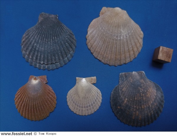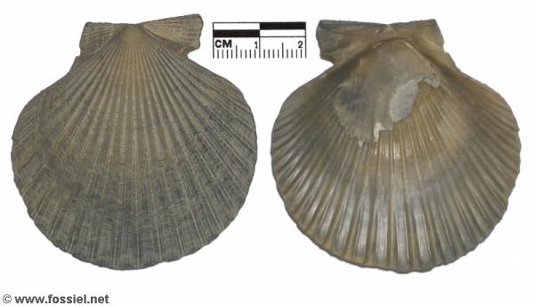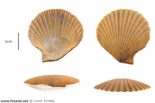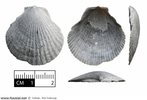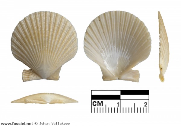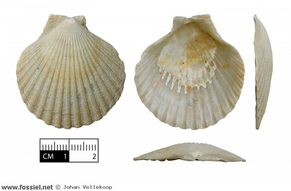 Een stukje van de schanier ontbreekt op dit exemplaar. Lijkt op Mimachlamys angelonii, maar heeft een 'touwladder' structuur tussen de ribben die M. angelonii niet heeft.