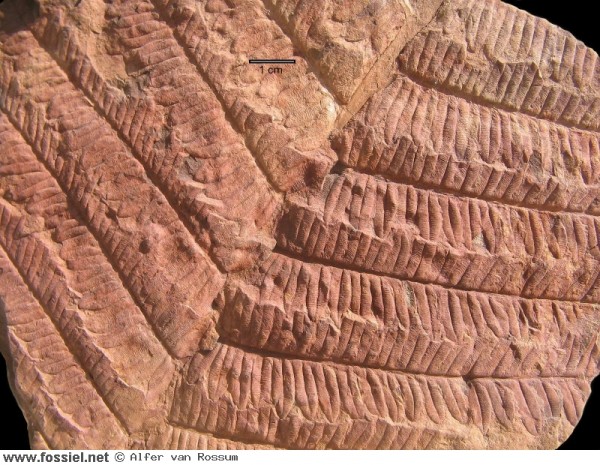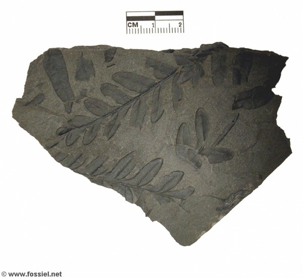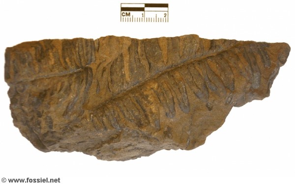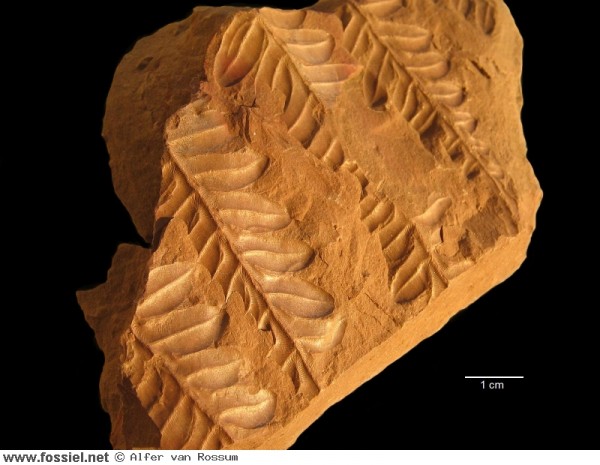 De op de rachis aansluitende bladvoeten, kenmerkend voor Alethopteris, zijn vooral in het onderste veertje goed te zien. Regionaalstratigrafie: Westfalien A (Langsettien)