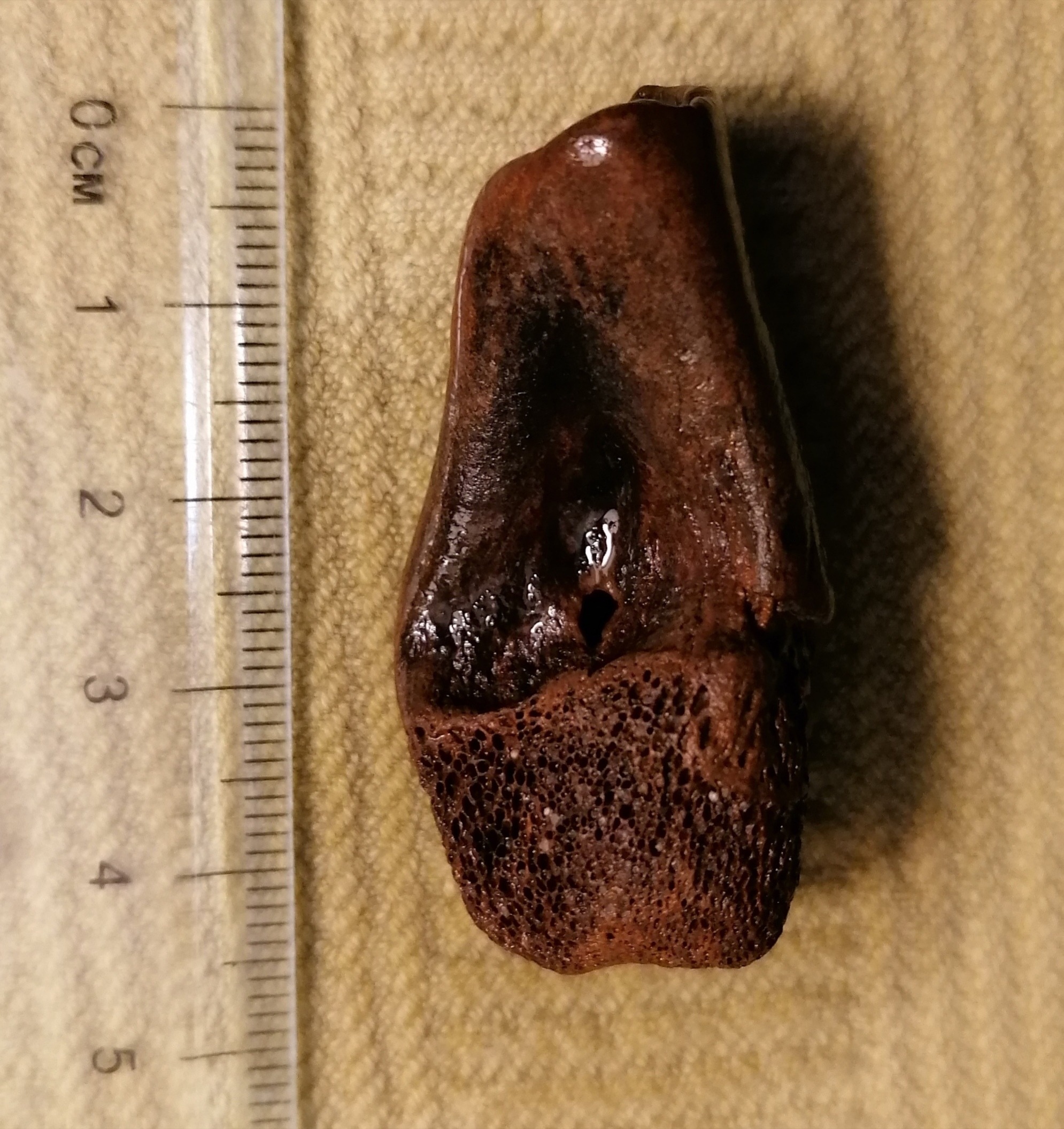 Distale humerus fragment evenhoevige formaat ree, schaap of geit. Strand groede.
