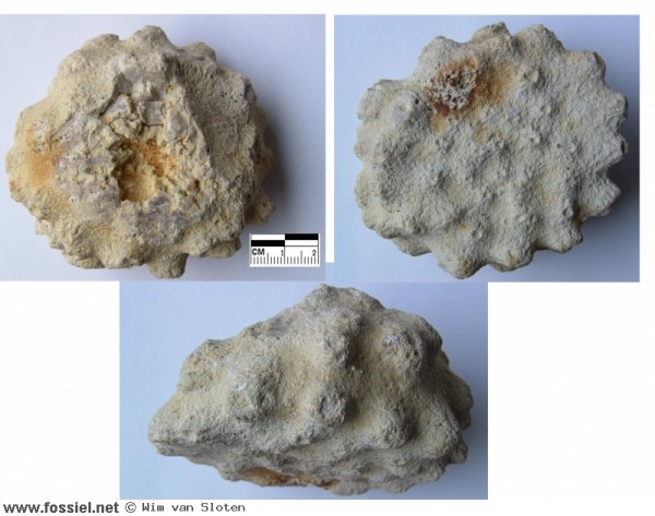 Een zeldzame Ordovicische spons uit Wilsum; mooi gepukkeld, met een platte basis. Op de foto's bovenkant, onderkant en zijkant.