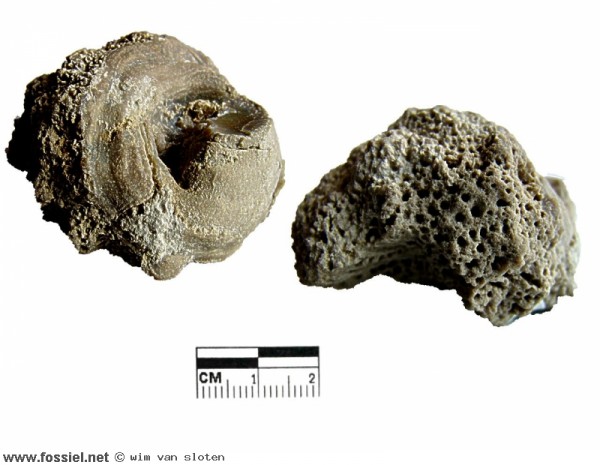 Het basisgedeelte van een Aulocopium aurantium (meestal wordt alleen het basisgedeelte gevonden). De spons is het best herkenbaar aan de zogenaamde 'rimpelhuid' aan de onderkant (Staringia 9, blz. 56). De linkerfoto laat de bovenkant zien en de rechterfoto de onderkant.