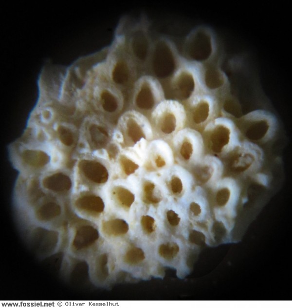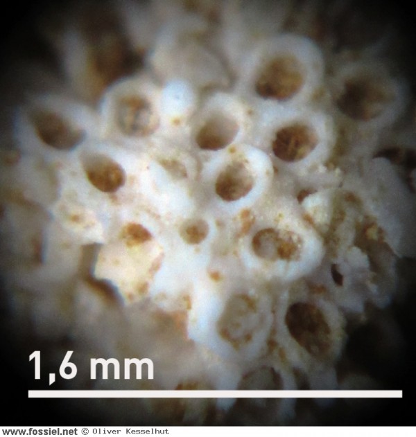 klein zoarium, vastgeghecht op een zeeegel-skelet. Gevonden in de Kalksteen van Nekum, Groeve Romontbos