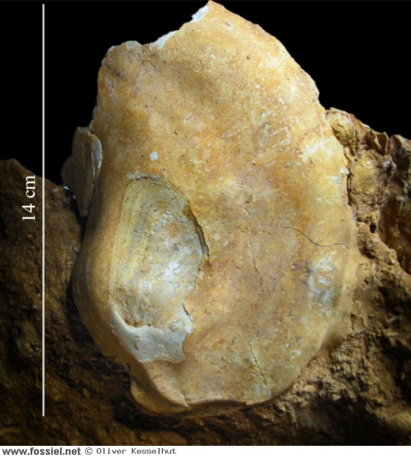 Deze 14 cm (!) grote oester was samengegroeid met een net zo grote Spondylus. De brok kwam uit de "grote afvalberg", die 2013 op de rechtse zijde van de groeve te bestuderen was. Helaas is deze berg compleet afgegraven en niet meer aanwezig.