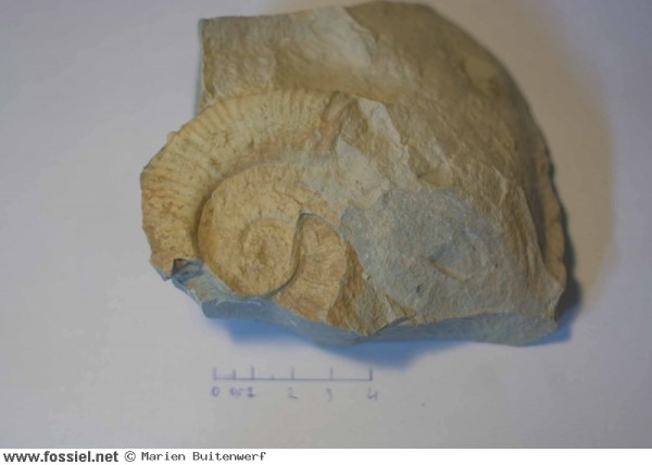 Heteromorfe (losgewonden) ammoniet uit Angles, ten noorden van Pointe du Chay.