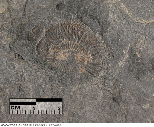 Deze steen met voornamelijk bovengenoemde ammonieten was in klei ingebed, en is gevonden in de groeve van Feuguerolles. Ook in de steen zit Hildoceras bifrons.