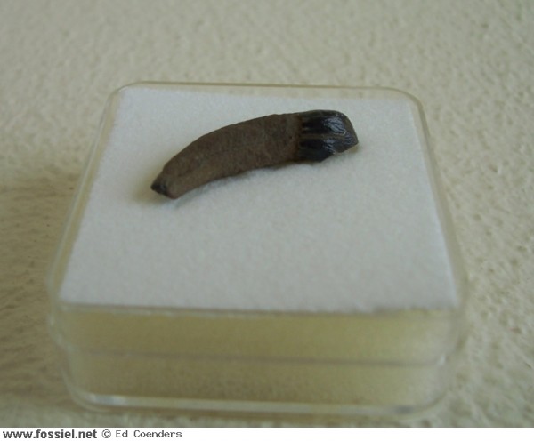 Tand van een zeldzame dolfijnen soort uit het mioceen. De opvallende ''druppelvormige tandkroon'' wijst op de foto naar rechts.