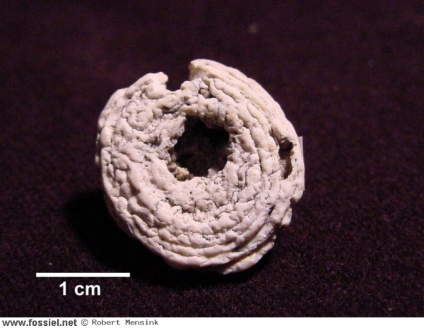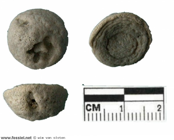De halfbolvormige Bryozo Diplotrypa loop je zo voorbij als je aan het zoeken bent. Dit kleinood is dan ook maar 1,5 cm. Het wordt ook wel Petersburger hoedje genoemd. Het is afkomstig uit een zandafgraving in Kloosterhaar (Twente). Op de collage: bovenkant, onderkant en zijkant. Mogelijk ook Siluur.