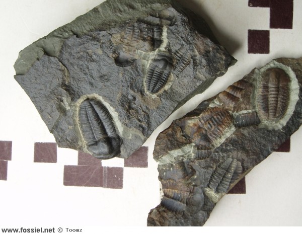 Twee bijna complete stukken. Het linkerstuk heeft geen pygidium. E.hoffi is een van de jongste trilobieten uit de Jince formatie.