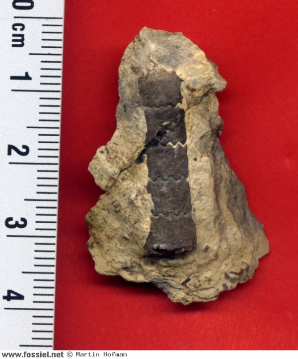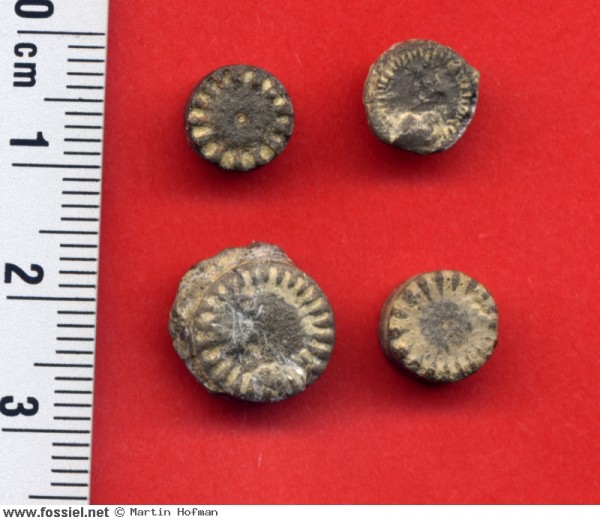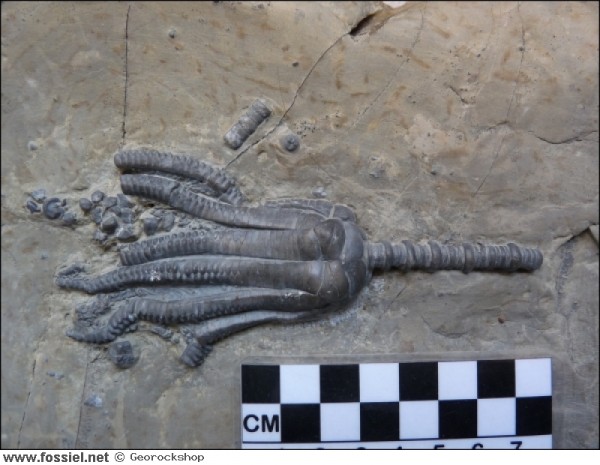 Uit de crinoidenkalk van de Satteldorf-Heldenmühle groeve, iets ten noorden van Crailsheim.