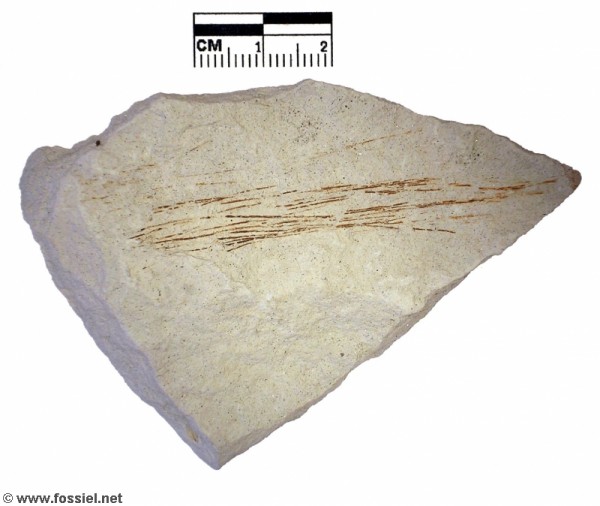 Worteltoef hexactinellide spons. Hexactinellide (glas)sponzen zoals bijv. Hyalonema en het bekende "venusmandje", staan op een voet van lange monoscleren (= éénassige skeletnaalden). In deze steen zijn deze prachtig bewaard gebleven en steken mooi af in de lichte kalksteen.