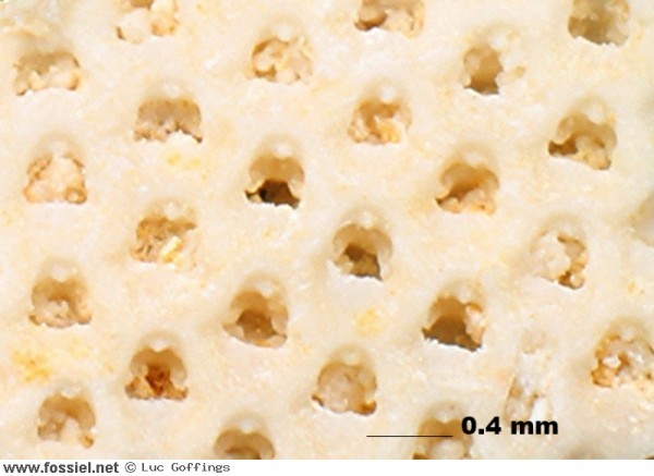 Dit bladvormig mosdiertje heeft typisch tandjes in elke mondopening ( 1 grotere distaal en 2 kleintjes lateraal). Vandaar de soortnaam odontophora, wat tanddragend betekent. De achterzijde( dorsaal ) van het "blad" heeft ook een zeer kenmerkende structuur gelijkend op visschubben. ( foto 2 )