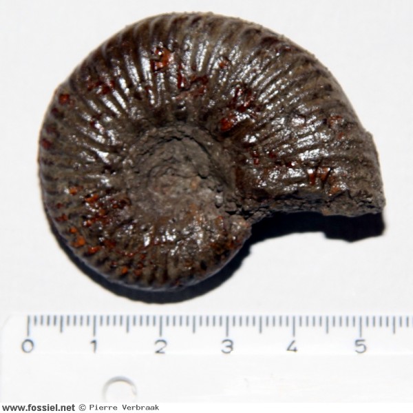 ca 50 ribben, verhouding navel/gehele fossiel ca 0,3, aantal "pukkels" aan uiteinde ribben aan de navelzijde.