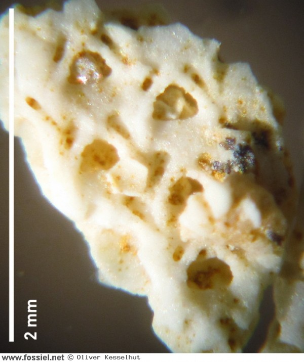 Een kenmerk zijn de twee schuine avicularia boven elke apertura.