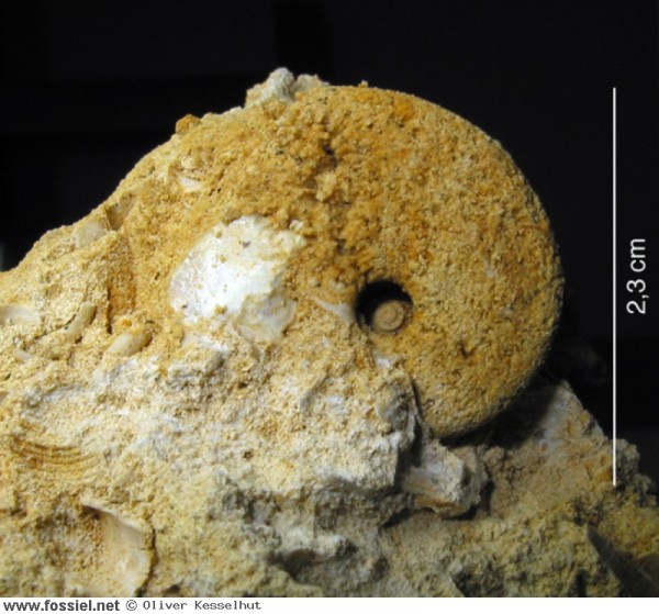 Deze ammoniet is tot op heden nog niet gevonden MET woonkamer; slechts het phragmocoon is bekend. Grootste doorsnede ammoniet 44 mm.