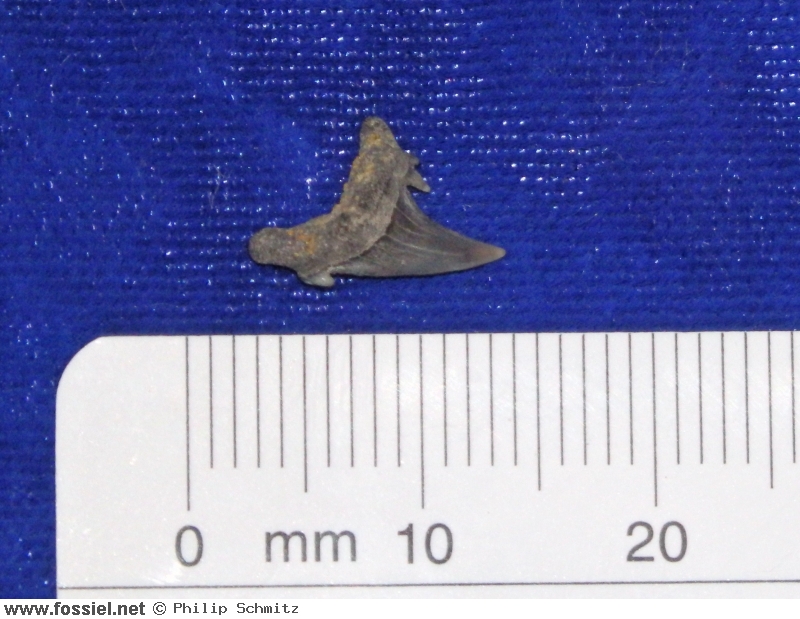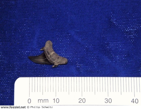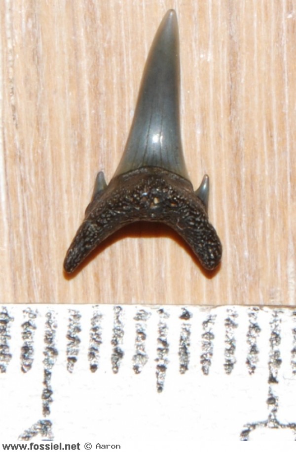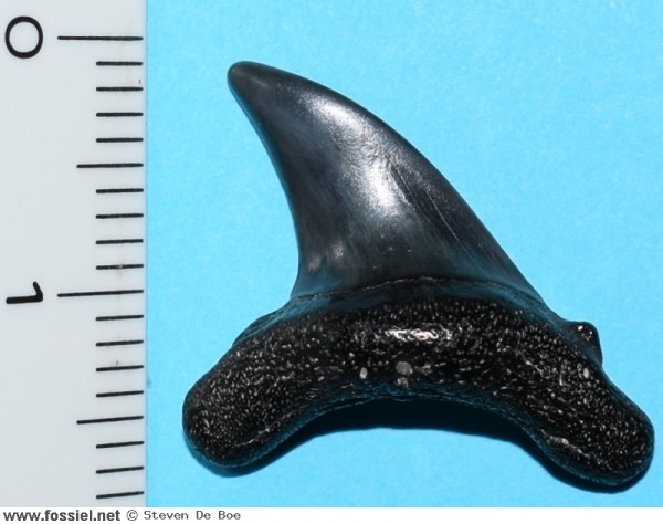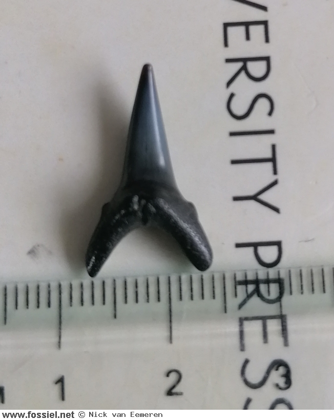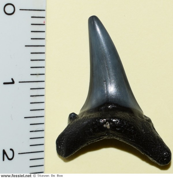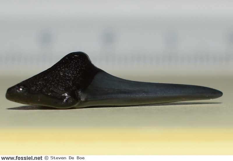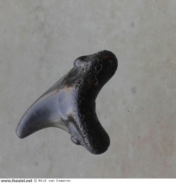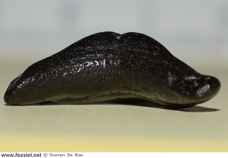 De kroon is aan beide zijden glad (dus zonder groefjes) en heeft een draaiing in de lengteas, dit is goed zichtbaar in het zijaanzicht . De spits van de kroon heeft een lichte buiging. Langs de vlakke zijde van de tand (zijde zonder voedingsgroef) hangt het kroonvlak over de wortel. De kroonvoet is breed. De snijrand van de tand loopt door tot aan de bijspits. Deze bijspits is klein in vergelijking met de kroon. De bijspits langs de distale snijrand is bijna volledig afgesleten, aan de andere zijde is de bijspits nog duidelijk merkbaar. U-vormige wortel met afgeronde worteleinden. Ondiepe voedingsgroef aanwezig.
