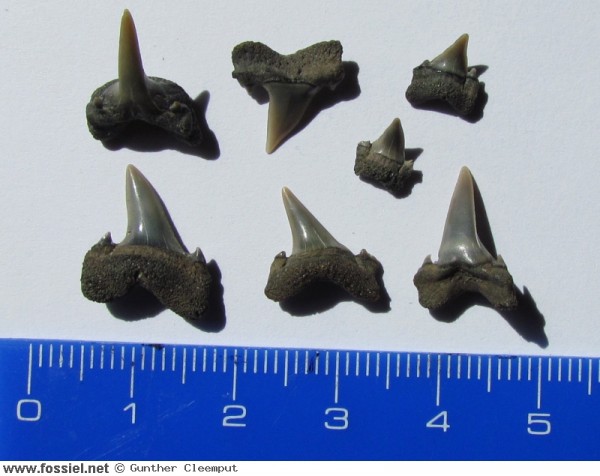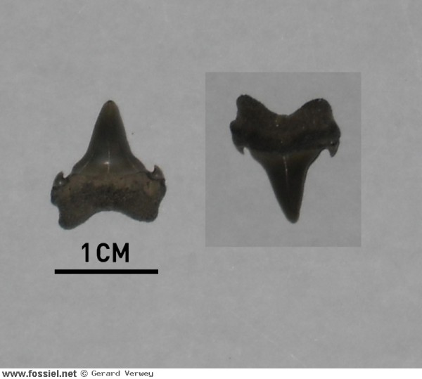 Verschillende posities van deze soort. Kenmerkend is de diepe labiale richel aan de voorzijde van de tand. De positie van de bijspitsen is variabel, zowel aanliggend aan de kroon als los van de kroon.