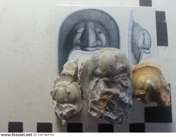 3 cephala. Helaas zijn thoraces en pygidia zeldzamer van deze redelijk algemene soort.