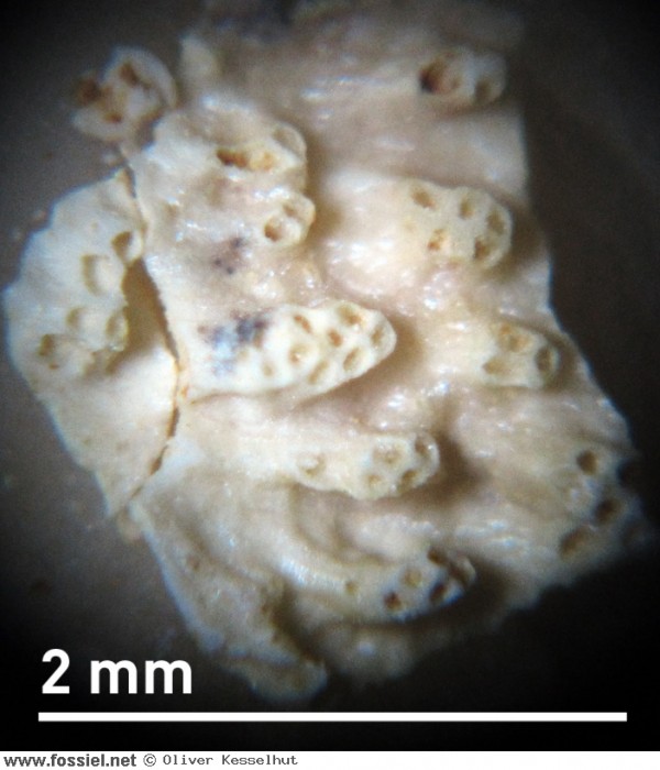 Let op: er worden 3 foto's van deze bryozoa-soort getoont: 1. een jong basis-gedeelte met radiaal verlopende fascicels. De gedeeltes tussen deze fascicels worden "maculae" genoemt. 2. een iets ouder basisstuk met zicht op de pluriseriele zooecia en zo genaamde "nanozooecia" (nano = dwerg), dus kleine zooecia, die kwa vorm en structuur op de autozooecia lijken, maar over geen reproductie- of verteringsfuncties beschikken. 3. een erect, hol takje dat een latere groeiphase afbeeld. Als restanten van de incrusterende phase beschikt de erecte vorm nog over de boven genoemde maculae. De erecte stadia werden tot de revisie van Voigt (1981/1982) tot de soort Cavaria ramosa gerekend.
