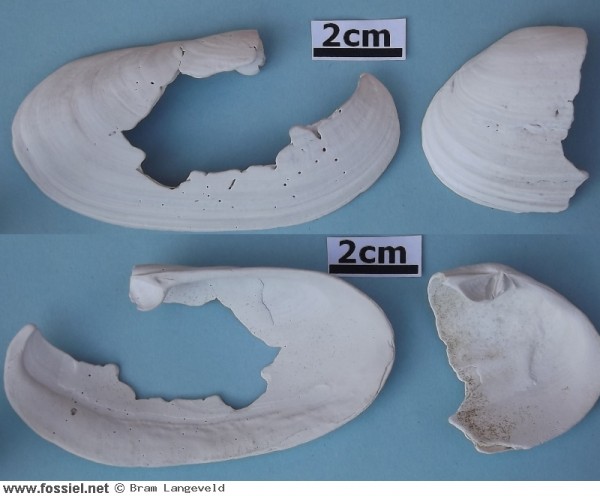Zeldzaam. Te herkennen aan o.a. het ver naar voren geplaatste slot. Vooral het linkerexemplaar is voor deze vindplaats erg compleet. Eemien.