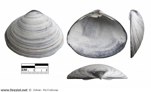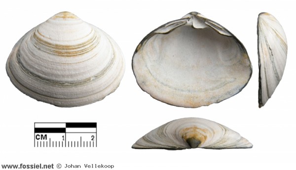 Fossiele Grote strandschelp. Algemene soort op het Banjaardstrand