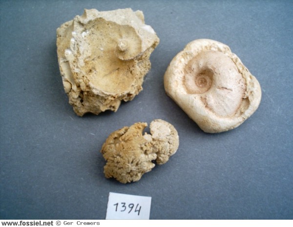 Zeldzame vondst uit groeve 't Rooth. Het meest rechtse object op de foto is een afgietsel van de afdruk. Midden onder is de steenkern (phragmocoon). Grootste doorsnede phragmocoon is 33 mm.