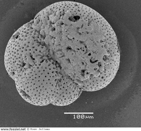 SEM-foto met de apertuur duidelijk zichtbaar. Het betreft hier een bentische soort die onder de lichtmicroscoop makkelijk verward wordt met planktonische soorten. Deze soort is niet veelvoorkomend, maar wel karakteristiek voor het Lutetiaan van het Bassin van Parijs (Le Calvez, 1961). SEM-foto met dank aan Johan Vellekoop (Fossildude) en de KU Leuven.