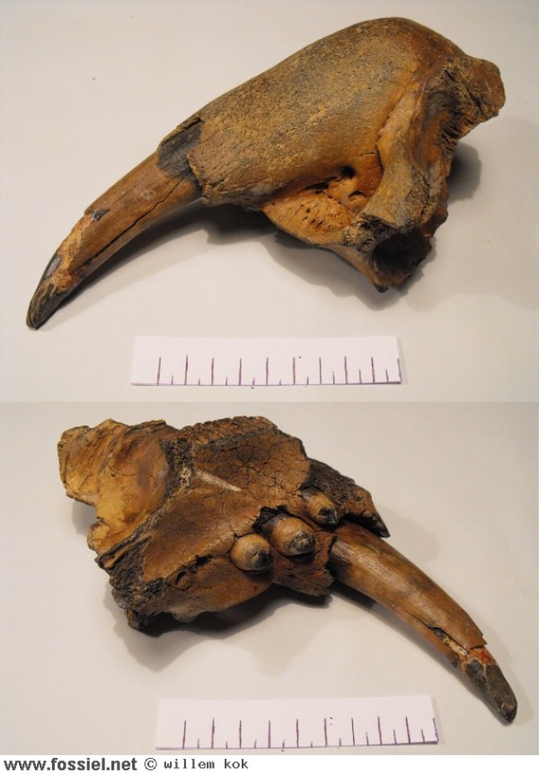 Linker maxilla en premaxilla met hoektand en drie (pre)molaren van een walrus.