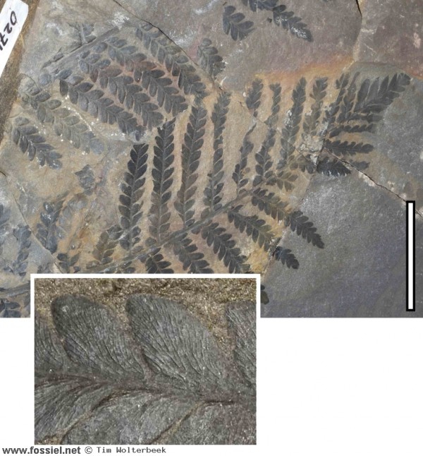 Merk op dat er geen middennerf optreedt in de pinnules (zie inzetfoto voor duidelijke nervatuur). Stefaniaan. Schaalbalk = 5 cm.