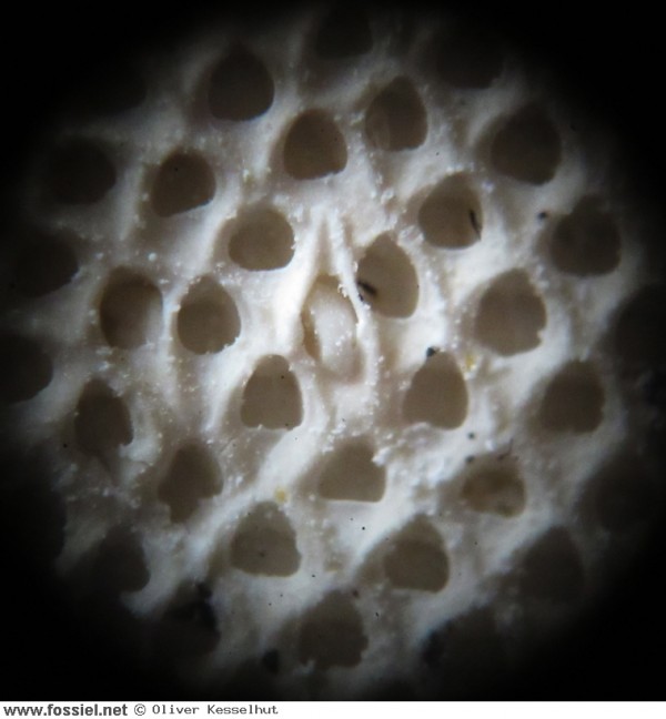 Een algemeen voorkomende soort in het Boven-Krijt van Zuid-Limburg. Althans toont dit stuk een zo genaamde "heteromorfie" – een afwijking van de "normale" groeivorm. De heteromorfe cellen tonen grote ovale mondopeningen in plaats van de regulaire semiovale vorm. Ook het typische spits toelopende proximale gedeelte van de enkele cellen ontbreekt.