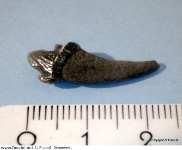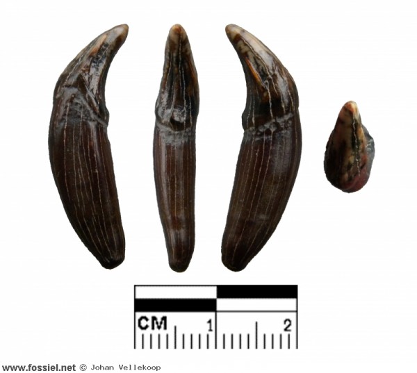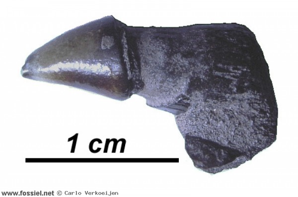 hoektand van een zeehond. Vermoedelijk uit het Plioceen of Pleistoceen.
